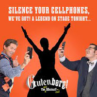 The first first thing you notice about the logo for the soon-to-close Gutenberg! The Musical! is the warm orange color. According to several sources (psychological, spiritual, etc.), orange represents energy, warmth, enthusiasm, optimism and adventure. These are attributes are all things one would want associated with a show.Now, mind you, I've not seen the show, but from everything I've read and heard about it, a musical about two guys trying to get their highly unlikely musical a producer would definitely fit the the criteria for using orange as their "show color."